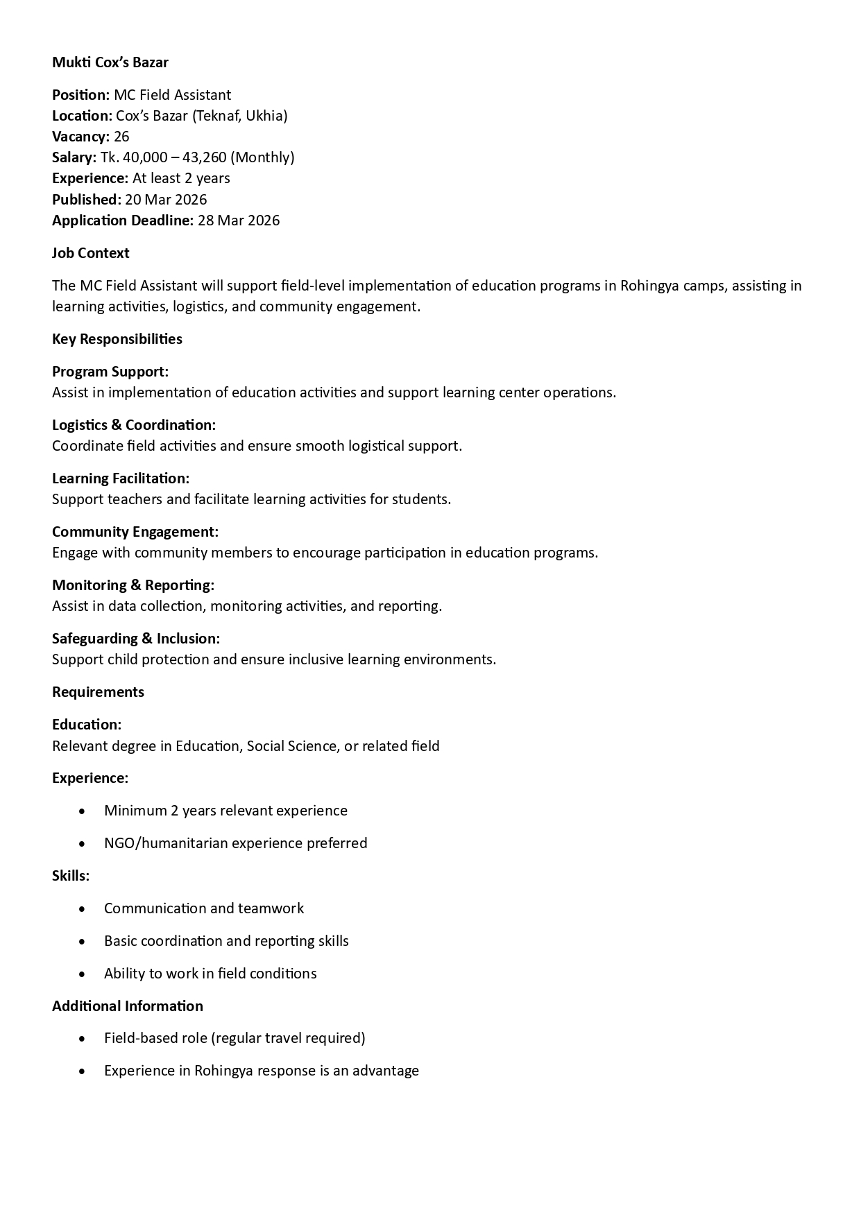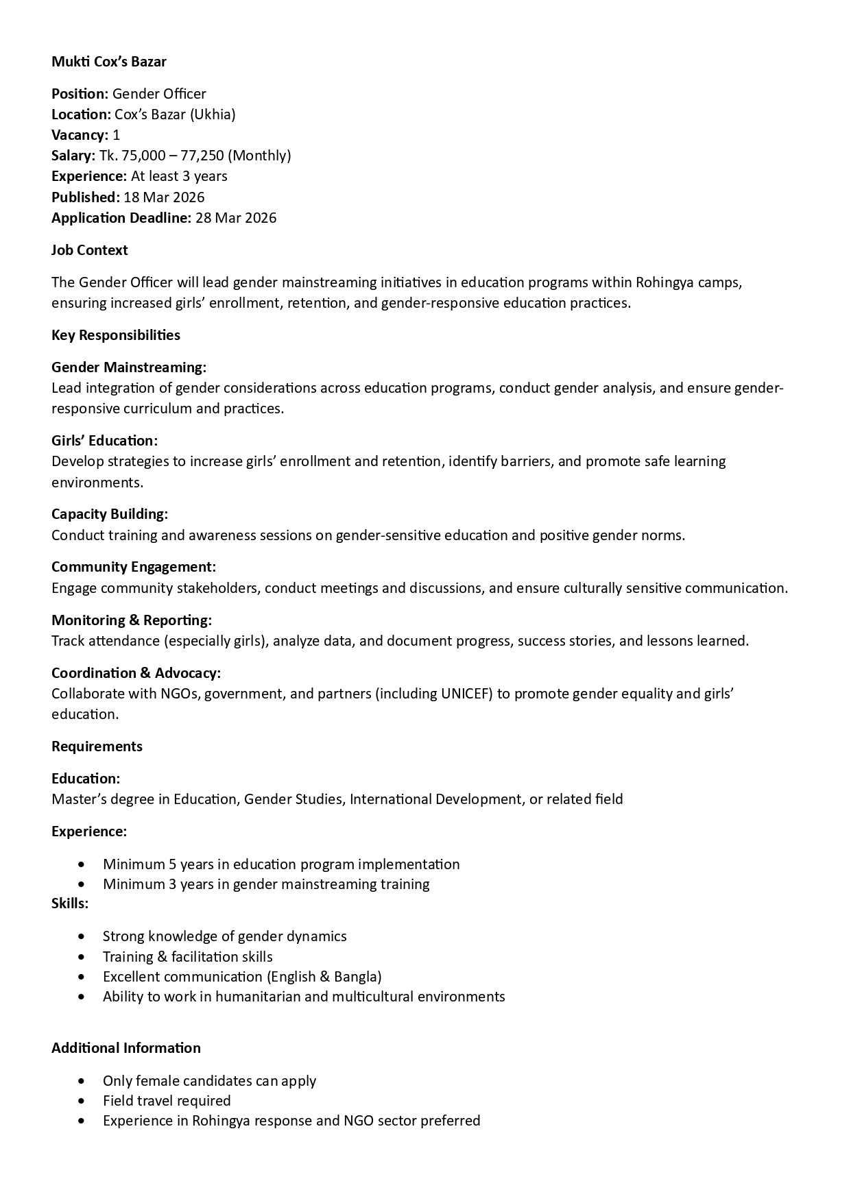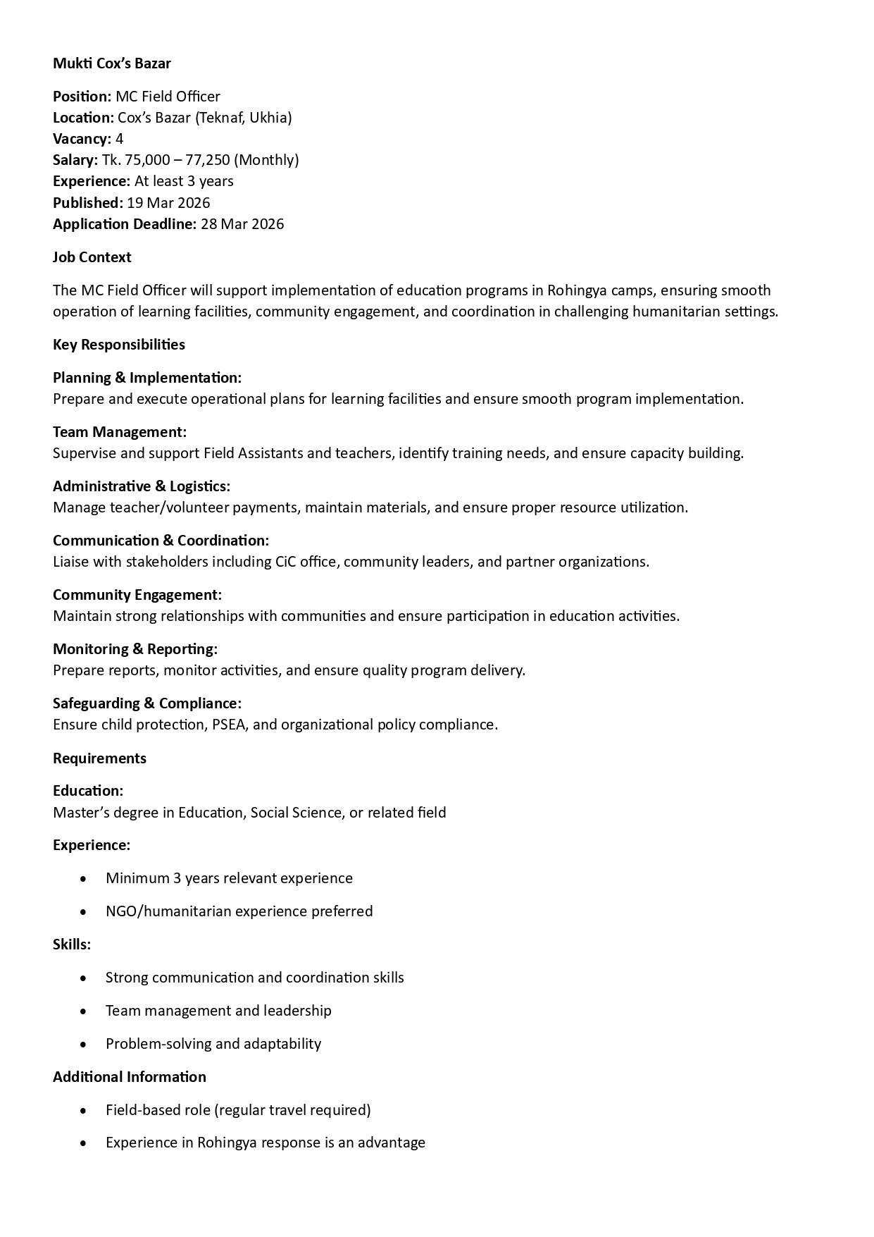 Circular of Teacher “ Education Programme for the FDMN and Host Community Children in Cox's Bazar”