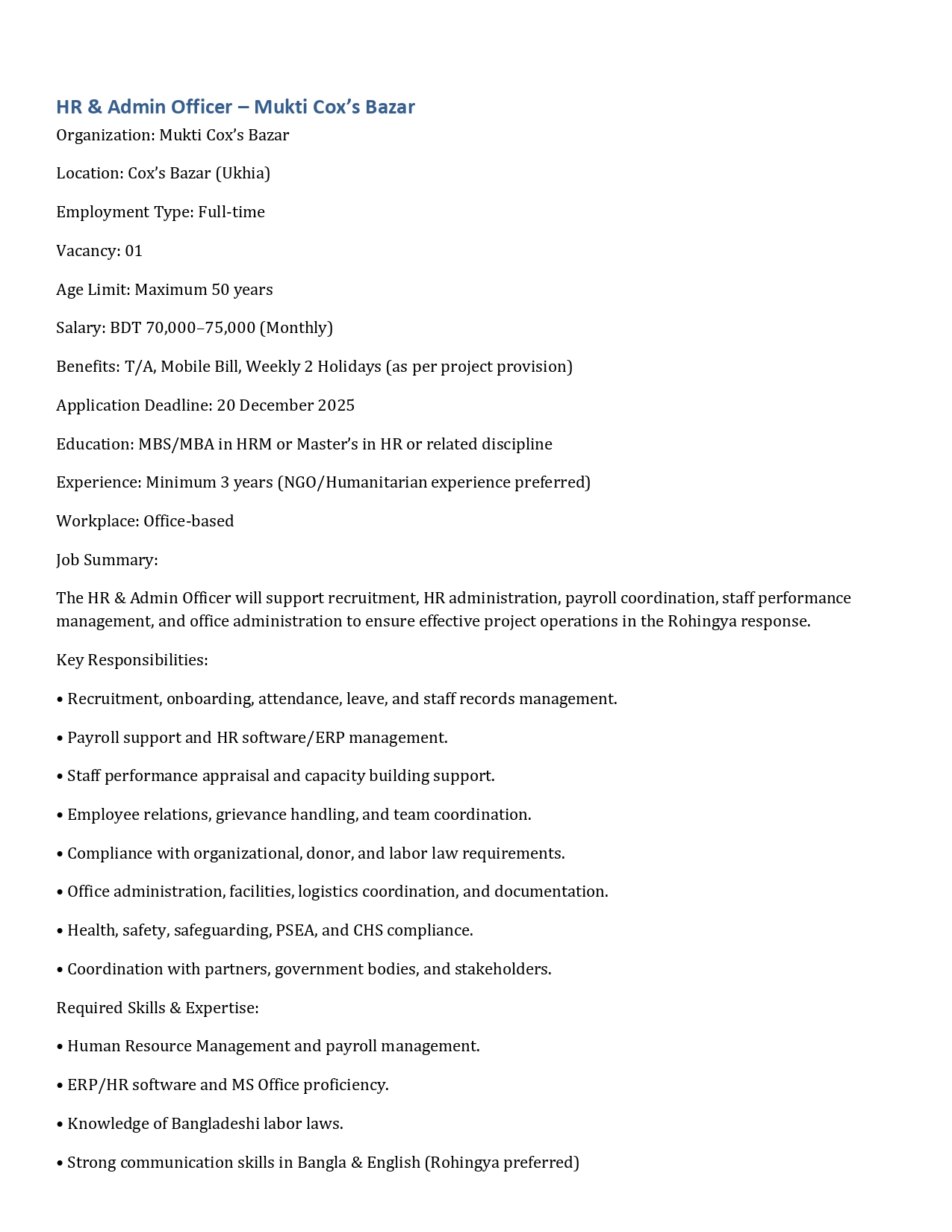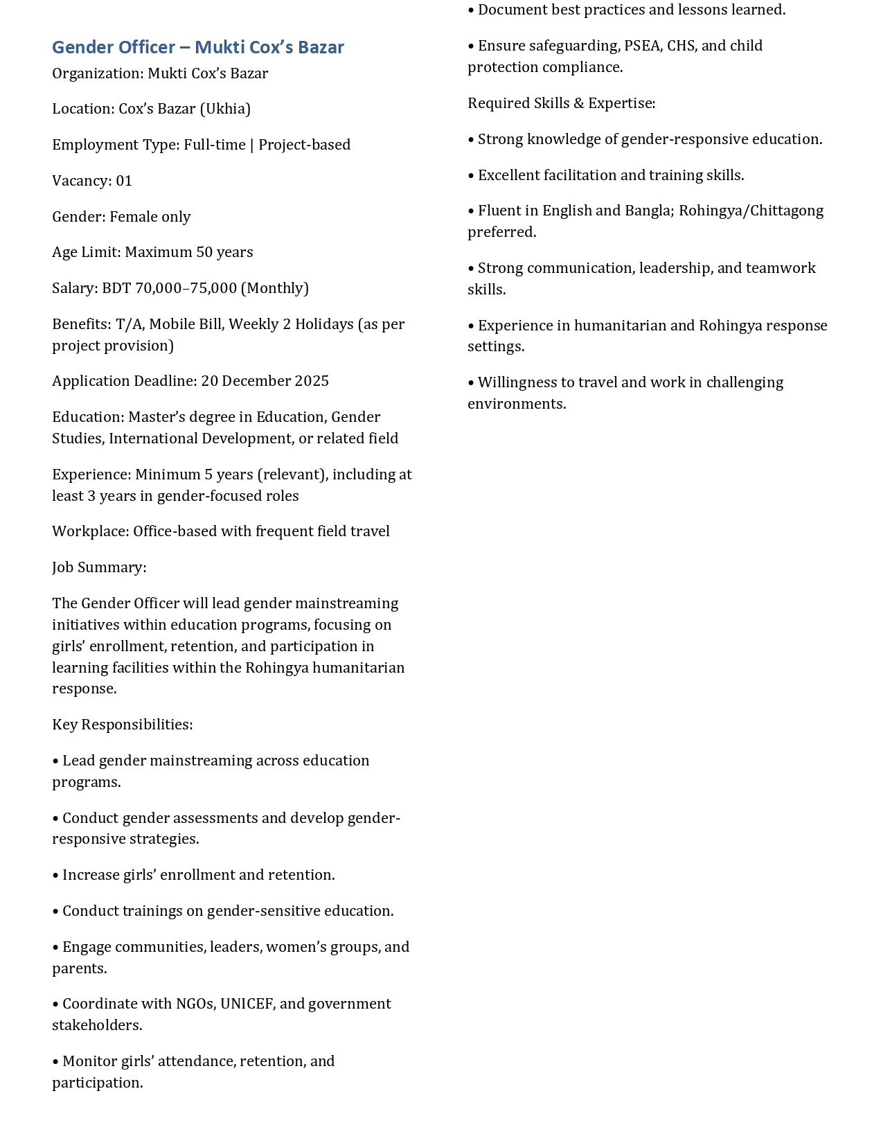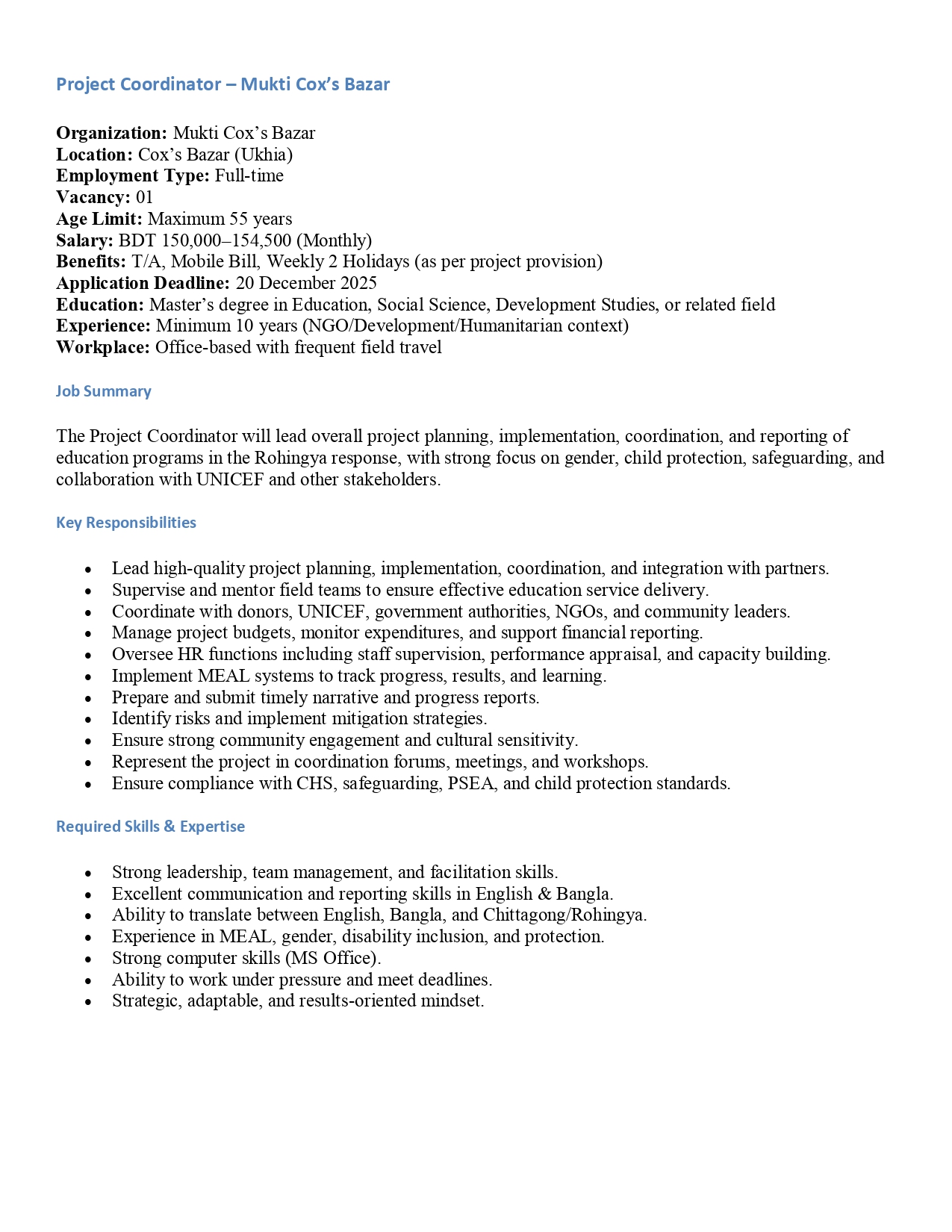 Circular of Teacher “ Education Programme for the FDMN and Host Community Children in Cox's Bazar”